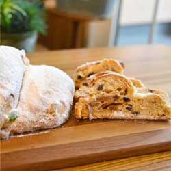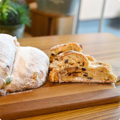 復興に向けた新たな商品として会津の銘酒「会津娘」と会津の特産物である皇帝献上品として知られる「会津身知柿」のドライフルーツをふんだんに使った新たなシュトーレン |